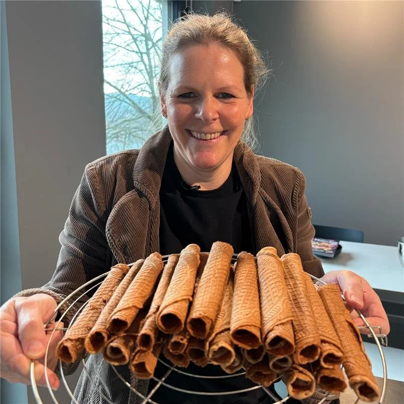 Unmittelbar nach dem Öffnen des Waffeleisens wird nun mit der Fleischgabel die ausgebackene Waffel zu einer Rolle geformt und auf einem Rost zum auskühlen auf der Naht platziert.